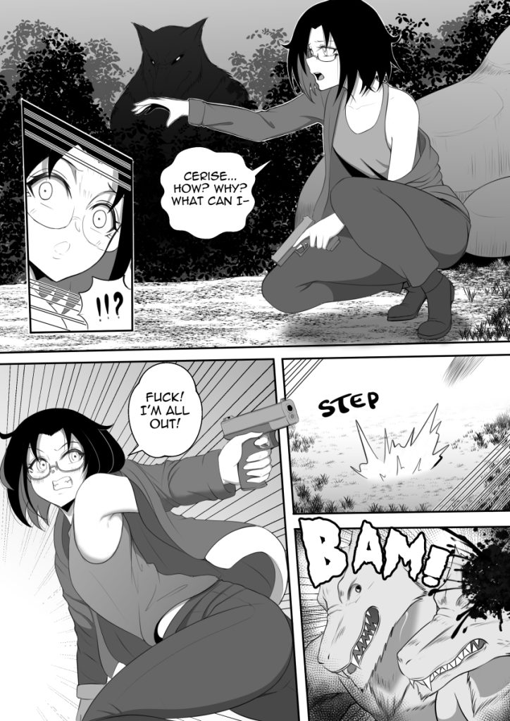 Story by Chirutai, art by Mushy Mushy This comic is read right to left. Cerise finally gets a page all to herself. Quick, Cerise, it’s your time to shine! Show us how you dispatch a group of vicious werewolves!